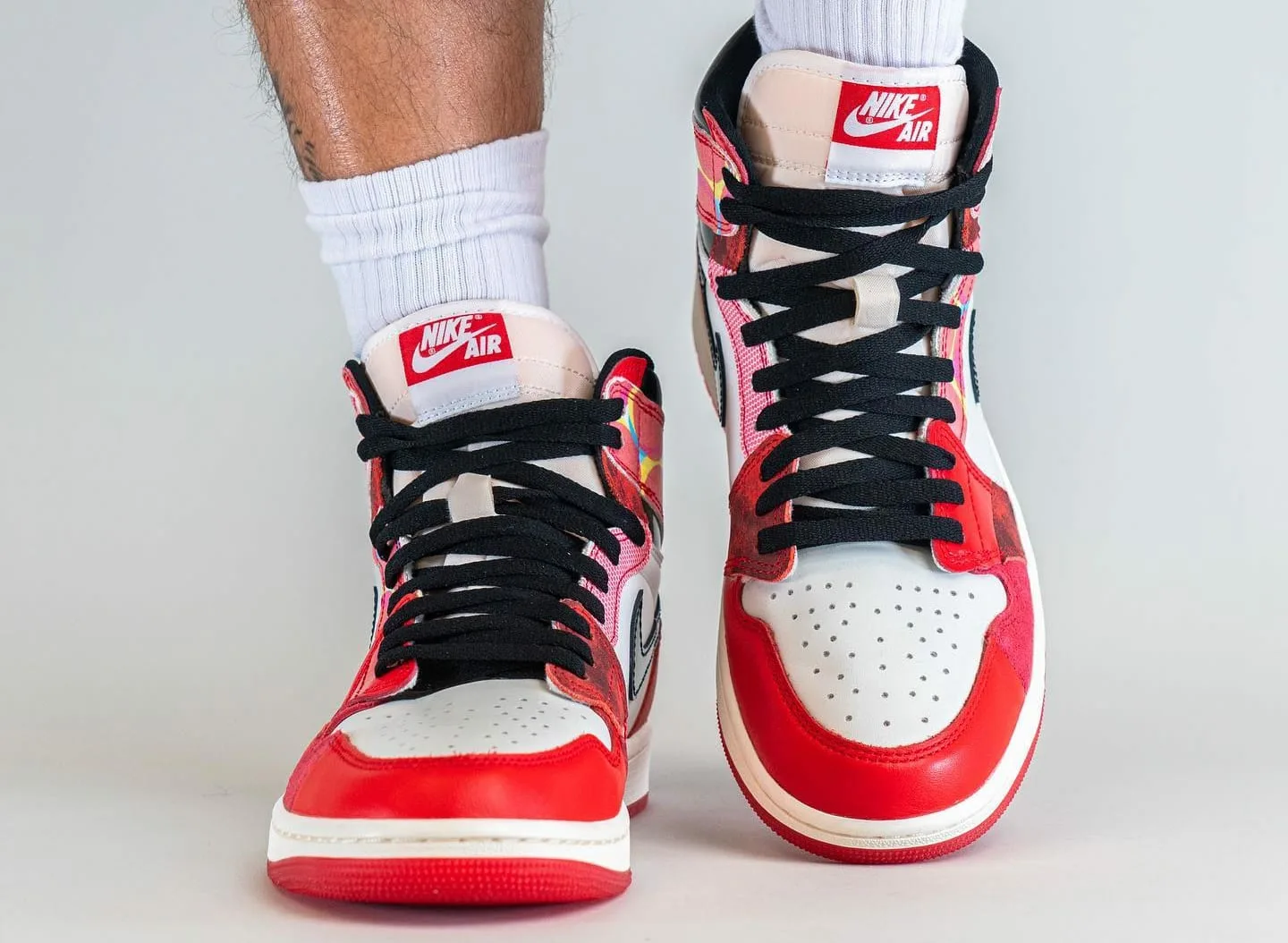 Coming in a Chicago-style colourway, the shoes feature the same white, red and black detailing – but the main difference comes on the upper. The red overlays are split into different parts, with different patterns and materials stitched together. This is done to create an effect mimicking the splicing of multiverses and cartoon styles which takes place in the movies. Otherwise, the shoes feature an off-white midsole and tongue, adding an aged look to the shoe, matching current trends in sneaker fashion at the moment.