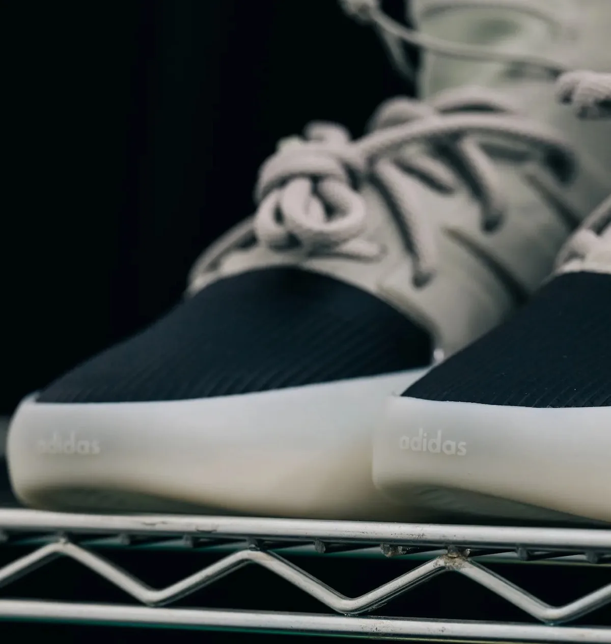 The shoe looks to come in a high-cut sock-like upper, using neoprene around the collar, and a reinforced material around the heel. Three stripes are present on the sides of the shoe, simultaneously acting as a plastic cage to potentially offer some support when playing Basketball. The shoes come with laces and a toggle around the collar. Lastly, rubber encases the sole and extends partially onto the upper. We have currently caught a glimpse of two colourways of the model. The first comes in white with a black toe. And the second in a reverse colourway, dressed in black with an off-white toe and sole.